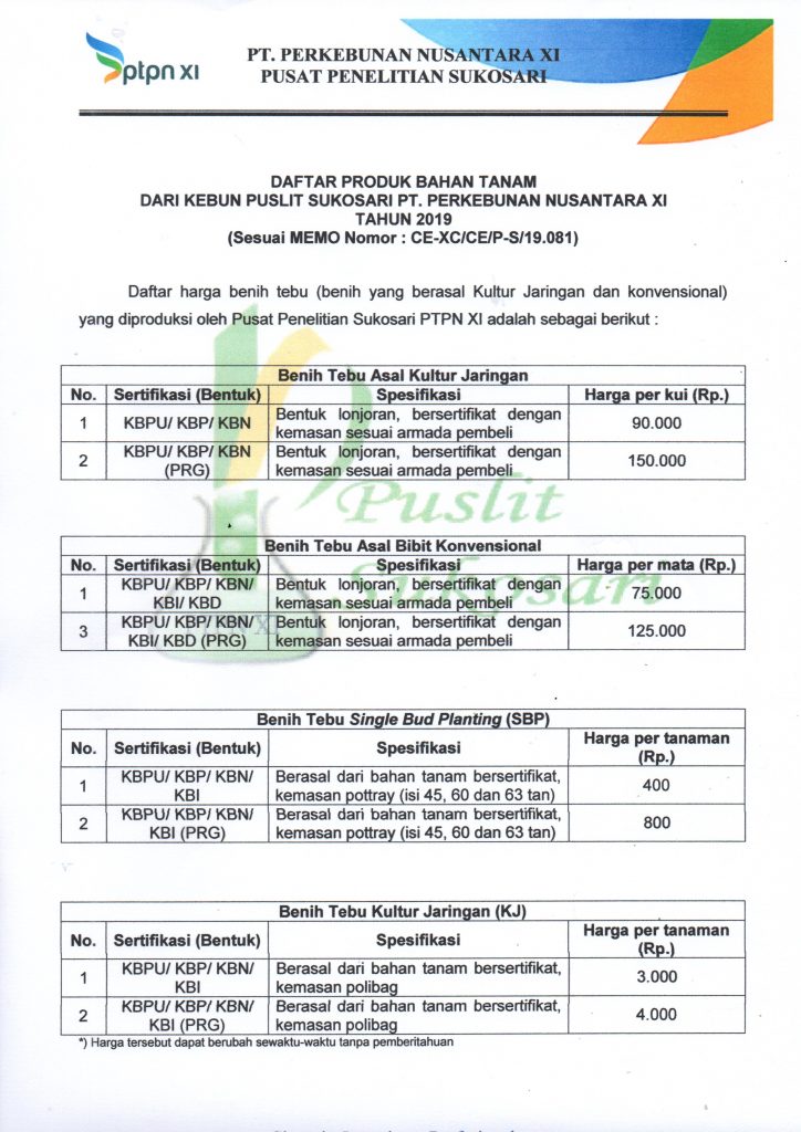 DAFTAR PRODUK BAHAN TANAM DARI KEBUN PUSLIT SUKOSARI PT. PERKEBUNAN NUSANTARA XI TAHUN 2019 (Sesuai MEMO Nomor : CE-XC/CE/P-S/19.081)